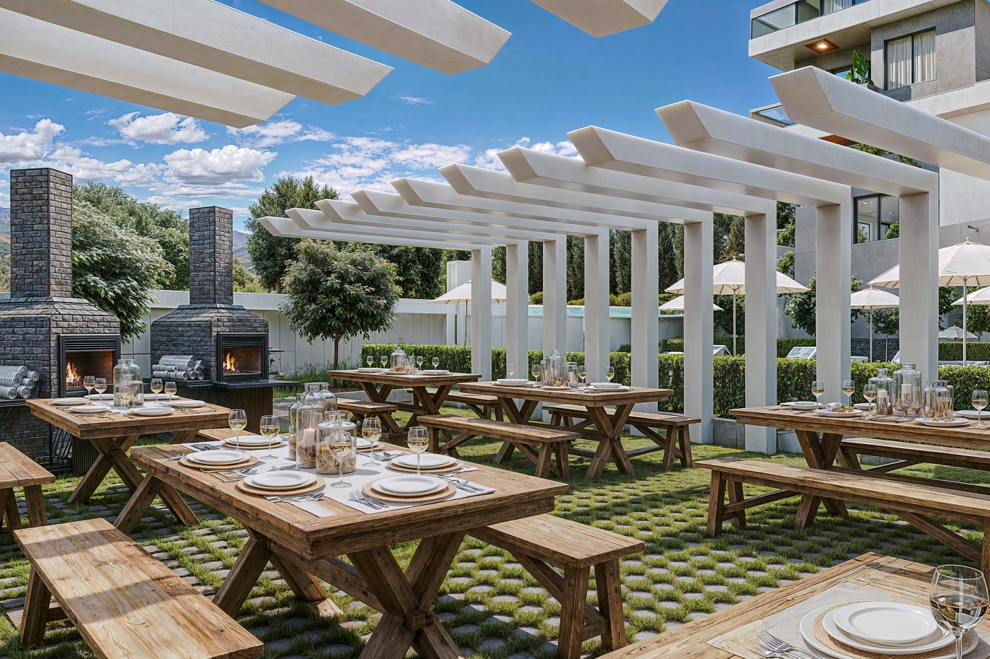An isolated area has been created for outdoor activities, featuring a Swimming Pool and Pavilion Area within a secure garden space for your children.
